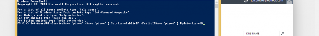 Now you’ll need to open an Azure PowerShell console window. Sadly at the time of writing you can’t assign a PIP through the web management portal so you’ll have to use PowerShell for now. If you’ve not got PowerShell installed click here to follow instructions on how to install and connect Azure PowerShell to your Azure account.